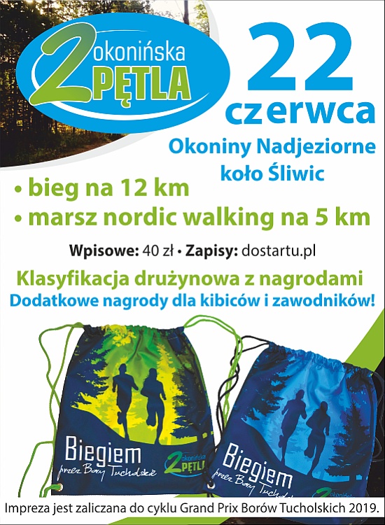 2. Okonińska Pętla - bieg na 12 km wokół malowniczego Jeziora Okonińskiego. Marsz nordic walking na 5 km. Bogaty pakiet startowy, nagrody finansowe i rzeczowe dla zawodników i kibiców. Swojskie jedzenie i piknik na plaży. Dla uczestników i ich rodzin 30 procent zniżki na weekendowy pobyt w o¶rodkach wczasowych.