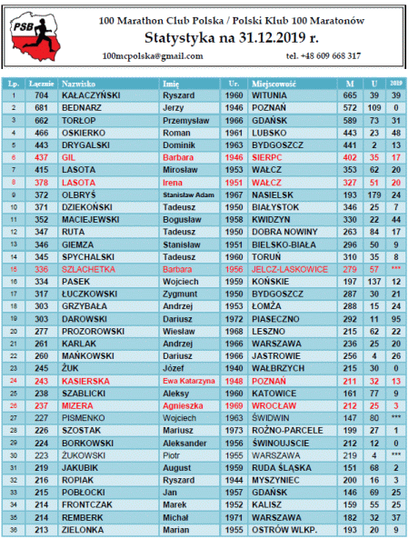 |  | Statystyka 100 Marathon Club Polska - 31.12.2019