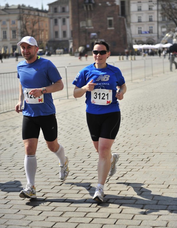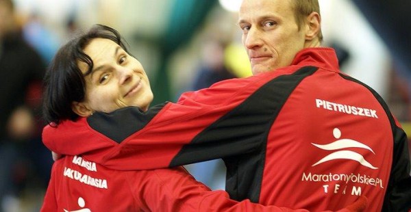 No, ja:) Zaczęłam biegać, potem zaczęliśmy jeździć na zawody i bardzo Piotrka do biegania zachęcałam, a on nie chciał i nie chciał. Ale…w końcu postanowił spróbować i kiedy okazało się, że on biegnąc pierwszy raz w życiu bez żadnego treningu, w dżinsach, koszuli sztruksowej zapiętej pod szyję i w skórzanych półbutach (sic!) ma czas taki sam, jaki osiągam ja po roku treningów, uwierzył, że to nie jest wielki problem i biegać zaczął. Owszem, ja startuję częściej, ale chyba tylko dlatego, że mi bardziej zależy:) Ale i Piotrek ma bodaj pięć półmaratonów na koncie. Miałby zapewne więcej, ale ma biegającą żonę – hehe. Tak naprawdę to wciąż jeszcze jest niewiele biegów, na których moglibyśmy powierzyć dzieci opiece organizatorów.