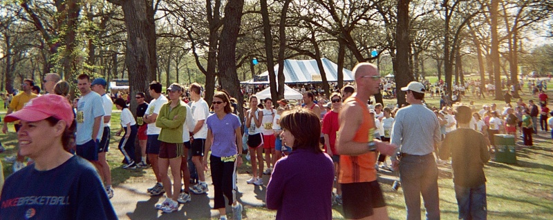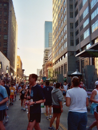 Pora startu zbliża się, jest nerwowo, i kiedy decyduję, że w razie czego pobiegnę bez numeru, kolejka nagle przyspiesza, odbieram swój pakiet, i jest jeszcze czas spokojnie założyć numer, przejść do strefy startu, a nawet zapoznać się z trasą. Wiedzie ona od małego parku – Loring Park, przez kilka zakrętów, do centrum, gdzie finiszujemy na głównej ulicy - Nicollet Mall. Minneapolis, w przeciwieństwie do wielu innych miast Ameryki, a obecnie i Polski, postanowiło utrzymać miejski charakter centrum - a więc przyciągnąć ludzi, by chodzili tam na zakupy, spacery czy do kawiarni. Zachowano budynki, które już były, połączono je podziemnymi przejściami i nadziemymi galeriami w jeden zespół sklepów, butików, galerii (zwanych w USA „mall”), hoteli, piekarni, pubów, cukierni, etc. Zamknięto dla ruchu samochodowego dwie albo trzy ulice, zamieniając je w ciągi spacerowe z kawiarniami, pubami i restauracjami z otwieranymi właśnie teraz, po zimowej przerwie ogródkami. Właśnie w tej scenerii będziemy rozgrywać drugą połowę biegu włącznie z finiszem.