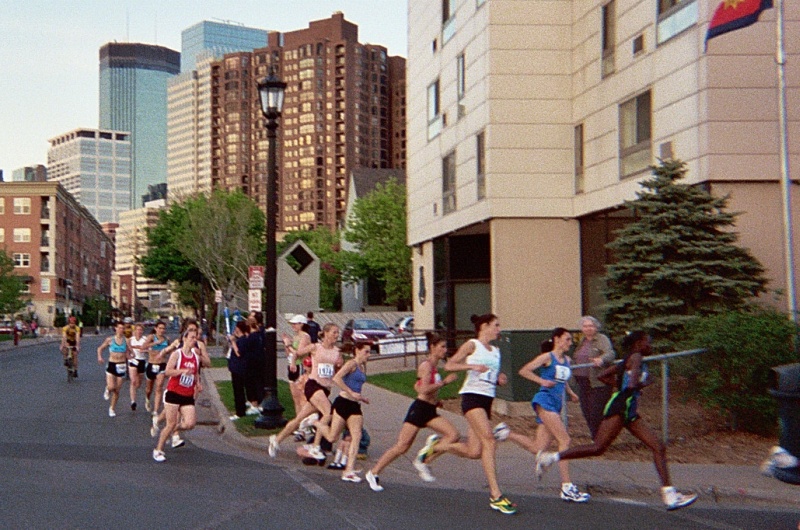 Bieg na dystansie 1 M (1,67 km) to dla mnie całkowita nowość - nigdy nie biegałem tak krótkich dystansów. Mój plan jest prosty: biec jak najszybciej. Na starcie jest już tłum – trudno mi ocenić ile osób, z rozmów dowiaduję się, że niektórzy przybyli nawet spoza Minneapolis. Startujemy, ja jestem gdzieś pośrodku grupy, trzeba się skupić na biegu, bo jest konkurencja o miejsce w stawce, o dobrą pozycję do finiszu. Jeszcze nigdy nie biegłem tak ostro, udaje mi się jakoś wyskoczyć z tłumu - to dzięki dobremu wejściu w dwa pierwsze zakręty - pomogło rozeznanie trasy jakie zdążyłem zrobić przed biegiem. Biegnę tak szybko jak nigdy dotąd, najważniejsze żeby utrzymać tempo odechu, ale i tak czuję, że mięśnie nie nadążają z odbieraniem tlenu z krwi, albo może to wysiada transport dwutlenku węgla z krwi do płuc?