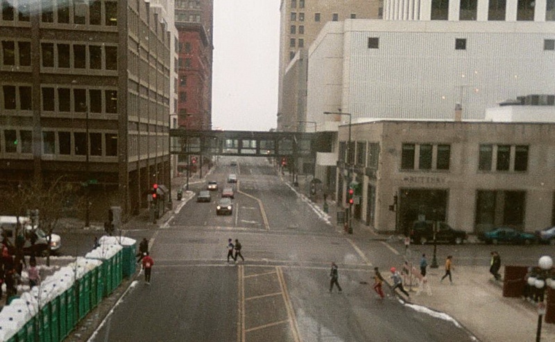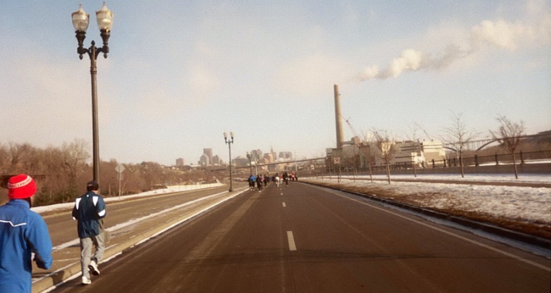 W przeddzień biegu wybieram kompromis i kupuję w markecie jednorazówkę, razem z nową kurtką biegacką. Rankiem, w sobotę, w dzień biegu jestem na starcie o godzinę wcześniej. O ósmej śródmieście St. Paul skąd startujemy jest jeszcze pustawe, zwłaszcza, że zacina ostry wiatr i pada śnieg co przy jakiś minus 15 stopniach daje temperaturę odczuwalną około minus 20. Zarówno St. Paul, jak i Minneapolis, mają w centrum miasta dobrze rozwinięty system galerii nad ulicami i podziemnych przejść pod ulicami, łączący większość budynków. To ze względu na surowe zimy oraz wilgotne i upalne lata (w Minneapolis system ten ma bodajże 50 mil długości). Korzystając z takich galerii zwiedzam centrum St. Paul i z góry przyglądam się przygotowaniom do startu.