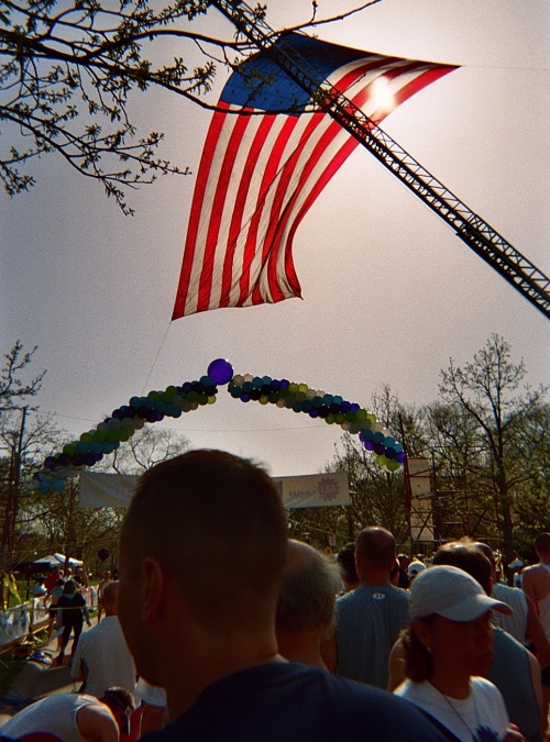 Wreszcie nadchodzi godzina biegu - ustawiamy się na starcie, z przodu są miejsca zarezerwowane dla zawodników elity, którzy mają licencje i ścigają się nie tylko o chwałę i miejsce na pudle ale i o nagrodę pieniężną. My, czyli większa część stawki wynoszącej lekko ponad cztery tysiące uczestników, walczymy o czystą sławę. Start odbywa się spod wielkiej flagi amerykańskiej i jest poprzedzony hymnem.