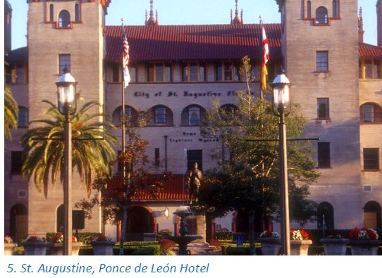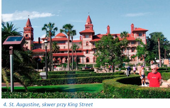 Spacer po mieście zaczynamy od King Street i dochodzimy do skweru przy rogu Sevilla Street. Widzimy okazały budynek Lightner Muzeum w stylu hiszpańskiego renesansu, dawniej hotel Alcazar. Po drugiej stronie ulicy wyłania się monumentalny Ponce de León Hotel, będący obecnie częścią Flagler College. Oba budynki są także unikalne z tego powodu, iż są jednym z najwcześniejszych przykładów budynków na świecie, wylewanych z betonu.
