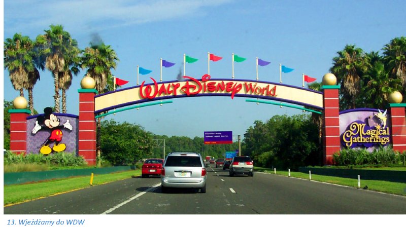Zbliża się południe, jedziemy do Walt Disney World. WDW to olbrzymi (ok. 80 km kwadratowych) kompleks rozrywkowy, położony niedaleko Orlando. Tworzą go 4 rozległe parki tematyczne: Magiczne Królestwo (Magic Kingdom), Epcot, Zwierzęce Królestwo Disneya (Disney"s Animal Kingdom) i Studia Disney-MGM.