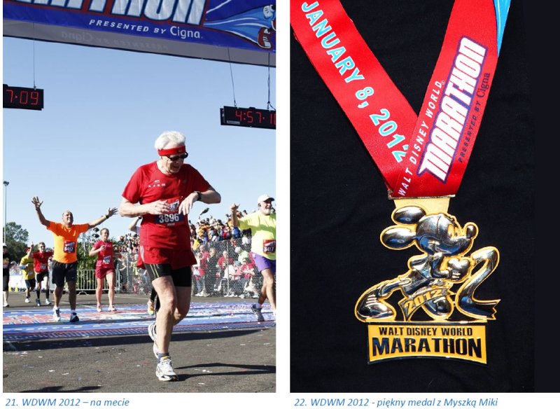 Niepowtarzalny klimat na trasie tylko częściowo oddają fotki 19 i 20. Przy towarzyszącym nam olbrzymim aplauzie kibiców wbiegam na metę. Wspaniały medal z Myszką Miki już na szyi i za chwilę wpadam w objęcia Grażki, która dzielnie "pilnowała" mnie na mecie. Bardzo Ci dziękuję, Kochanie :)))