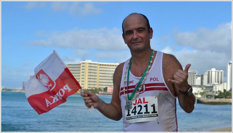 9 grudnia 2012 roku o godzinie 4.00 stoję na starcie Honolulu Marathon 2012 wśród blisko 35 tysięcy sportowców. W większości to Japończycy, gdyż głównym sponsorem maratonu są Japońskie Linie Lotnicze. Kilka minut przed startem organizator wita wszystkich uczestników, następnie jak na każdym amerykańskim maratonie następuje odśpiewanie hymnu narodowego i zaraz potem punktualnie o 5.00 podobnie jak na każdym maratonie na świecie strzał startera.