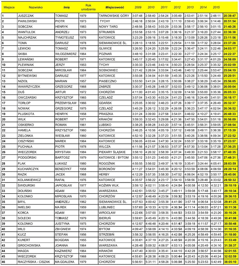 | | INFORMACJA POSIADA MULTI-FORUM | POROZMAWIAJ |  | 11 Silesia Marathon - Katowice, 6.10.2019 | 4 2019-09-23 |  | 2018 - 10. PKO Silesia Marathon | 20 2018-10-08 |  | 2017 - 9. PKO Silesia Marathon | 55 2017-10-11 |  | 2016 - PKO Silesia Marathon | 59 2016-10-12 |  | 2015 - PKO Silesia Marathon | 82 2015-10-11 |  | 2014 - Silesia Marathon | 323 2014-10-16 |  | 2013 - Silesia Marathon | 384 2013-06-07 |  | 2012 - Silesia Marathon | 404 2012-05-14 |  | 2011 - Silesia Marathon | 723 2011-06-09 |  | 2011 - Luźne rozmowy fanów | 113 2011-05-05 |  | 2010- Silesia Marathon | 424 2010-06-14 |  | 2009 - Silesia Marathon | 712 2009-06-21 |