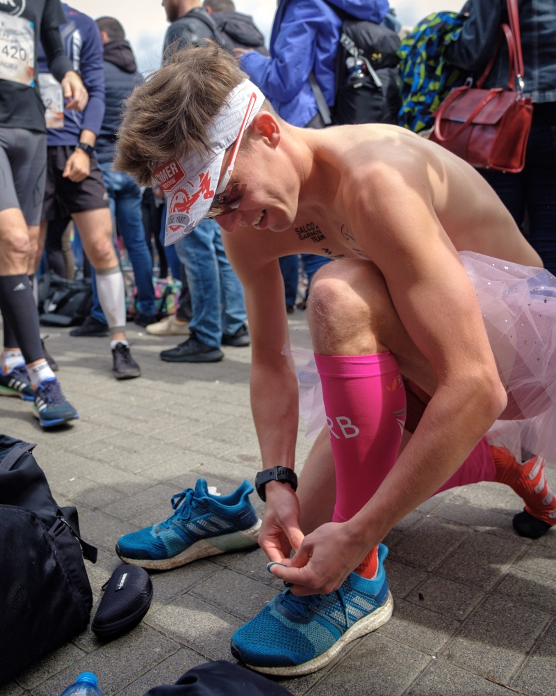 Pierwsze starty zaliczyłem już w lutym – kontrolnie. Potem – w marcu sprawdzenie swoich sił podczas WroActiv na 10 km. Wyszło przyzwoicie, aż teraz żałuję, że później nie było już szans, by wystartować w jakimś biegu na 10 km. Czas 32:47 w samotnym i bardzo, ale to bardzo wietrznym biegu teraz cieszy. Czułem moc! Byłem na fali i wykorzystałem to podczas Półmaratonu Warszawskiego – 1:10:57! To był pierwszy tydzień, gdzie odpuściłem treningowo. Kilka dni luźnych wpadło. Organizm był świeży i gotowy do walki. Po tym biegu wiedziałem, że rozmienić 2:30 w maratonie to formalność. Podczas półmaratonu mimo mocnego początku i kryzysu potrafiłem wrócić na ostatnich 5 km to solidnego tempa. I to wszystko w stroju wróżki!