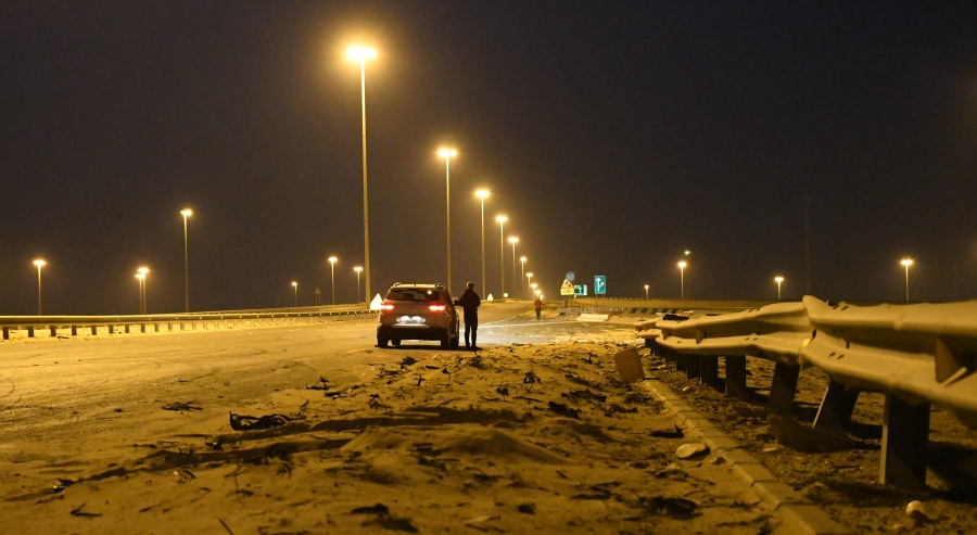 W wielu miejscach przebieg autostrady znaczą tylko stojące samotnie słupy oświetleniowe, co ciekawe nocami wciąż włączone. Niesamowitości dodają wystające gdzieniegdzie metalowe obręcze barier energochłonnych – tworząc obraz niczym z filmów katastroficznych. Oczywiście miejscowym piach w niczym nie przeszkadza: suną zasypaną drogą na swych potężnych terenówkach z prędkościami dochodzącymi do 100 kilometrów na godzinę. Dla nich pustynia i piach to żywioł, z którym zbratani są od zawsze.