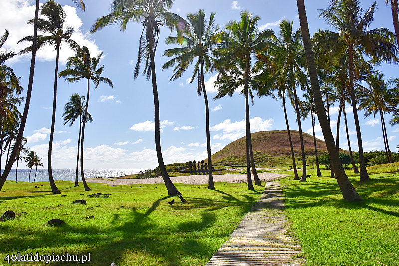 Przy plaży rosną piękne palmy. I nie byłoby w tym nic dziwnego, gdyby nie fakt że tubylcy wycięli ostatnie tutejsze lasy palmowe ponad dwieście lat temu. Katastrofa ekologiczna przyczyniła się do zagłady tutejszej cywilizacji, ale Anakena cudem przetrwała. Wystarczy odejść jednak kilkadziesiąt metrów od tego miejsca, a ponownie stajemy pośrodku stepowego, szarganego wiatrem pustkowia, po którym grasuje wyłącznie wiatr. Nad Anakeną zalega jednak cisza. Ale zejście do oceanu tuż poza plażą staje się od razu niemożliwe ze względu na ostre skały. Ocean staje się ponownie groźny i niedostępny.