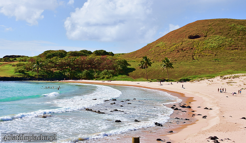 Napisałem, że nie ma na Rapa Nui ani jednego portu. Ale w całej swojej niesamowitości natura przygotowała na wyspie niespodziankę. Na samej jej północy znajduje się jedyna w promieniu tysięcy kilometrów zatoka, a w niej… jedyna na całej wyspie plaża. Piaszczysta plaża. Najpiękniejsza plaża świata – nasza tytułowa Anakena.