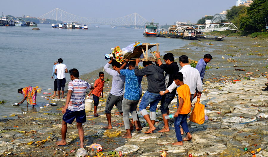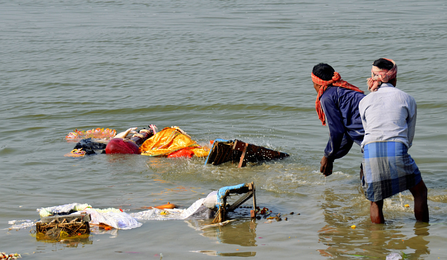Księżniczki były – i tutaj przepraszam, ale liczę na słynną hinduską wyrozumiałość – przepięknie kolorowane, kształtowane, dekorowane. Wszelakiego rozmiaru: małe, duże oraz takie które robiły PO PROSTU WRAŻENIE samym wzrostem. Podążyliśmy więc za tymi szalonymi samochodami aż do samej rzeki. Tam nasze bohaterki wyładowywano z ciężarówek i dumnie, w kakofonii dźwięków, śpiewów, walenia pokrywkami – zaprowadzano nad sam brzeg. A potem buzi buzi i nurka do wody :-)