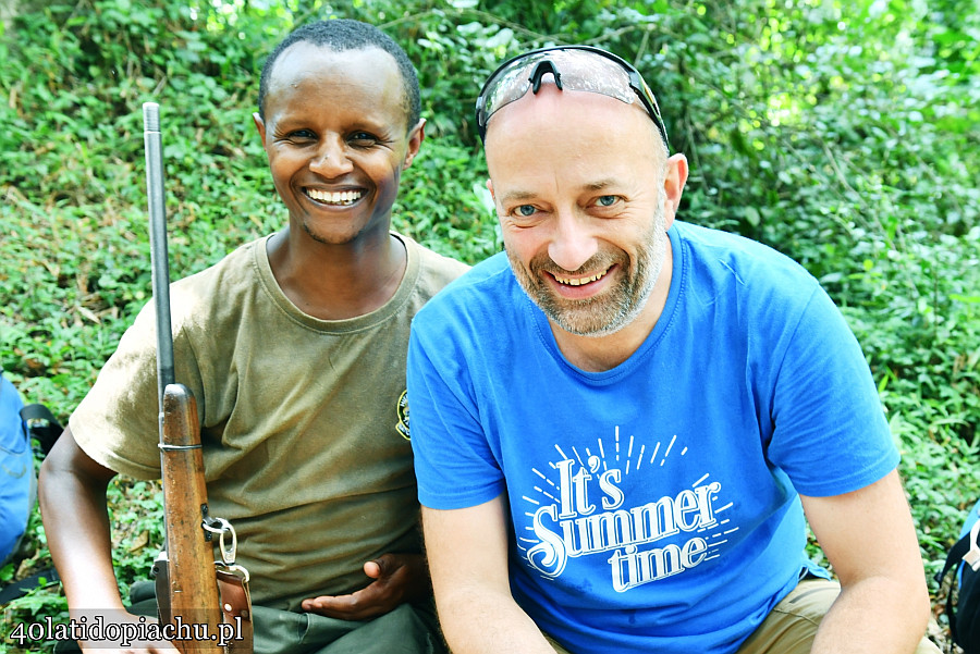 Wyruszamy późnym rankiem. Tym razem do przejścia mamy około 9 kilometrów, w tym kilometr w górę. To plan minimum, bo jest jeszcze możliwy bonus do zdobycia. Dzień wcześniej szliśmy w podkoszulkach i krótkich spodenkach, tym razem ubieramy się już nieco cieplej. Strażnik z karabinem jest nieco poddenerwowany bo na wąskim szlaku którym wchodzimy leżą świeże bawole kupy. Te zwierzęta wcale nie są sympatyczną odmianą udomowionych krów. Na wysokości 3000 metrów ścieżkę przecina strumień będący jednocześnie wodopojem dzikiej zwierzyny. Jest jednak pusto, i możemy spokojnie przejść nie nadrabiając kilometrów ani nie tracąc czasu na czekanie. Nie musimy także uciekać na drzewa. Uff.