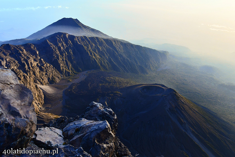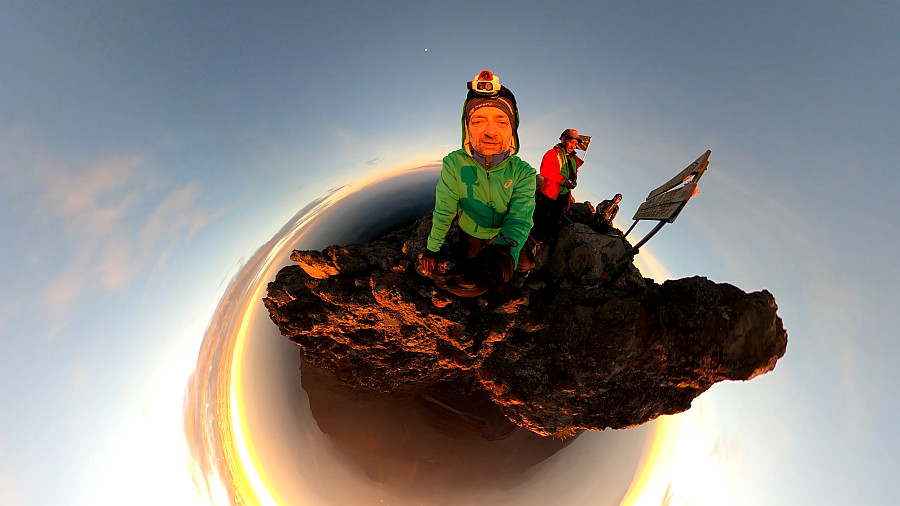 Szczyt jest bardzo wąski, i ma zaledwie kilka metrów kwadratowych. Znajduje się na nim tablica, kilka kamieni, a wokół – po trzech stronach przepastne urwiska. Widok uzależnia. W dole, w kraterze pierwotnym widać pozostałości po ostatniej erupcji. Ściany są niemal pionowe, fantastyczne, powalające. Na sam szczyt prowadzi wąskie rumowisko – w zapalającym się świetle dnia widzimy drogę powrotną. Czeka nas ładne cacko do pokonania.