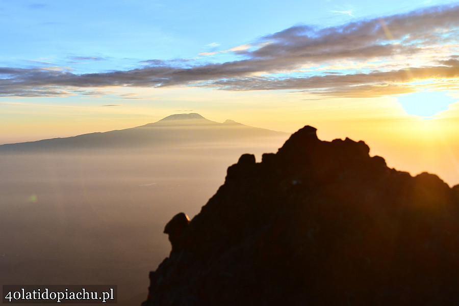 O 6:30 rano, z kilkunastominutowym opóźnieniem stajemy na szczycie. W oddali, dokładnie nad masywem Kilimandżaro natura prezentuje swój niezwykły spektakl – wschodzi Słońce.