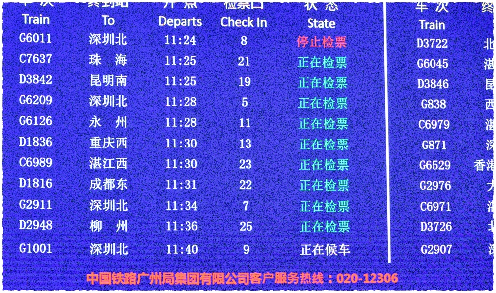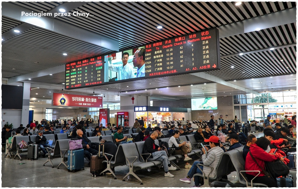 Następnie oczekujemy na swój pociąg w hali oczekiwania; bywa, że jest ona wręcz gagrantuicznych rozmiarów. Można tutaj zjeść, zrobić zakupy, oglądać media, spacerować, zrelaksować się. Telebimy pokazują informację o odjeżdżających pociągach – nr składu, peron, trasa, czas przyjazdu i odjazdu, status – wszystko jak na lotniskach. Wiele informacji jest podawanych w chińskich „krzaczkach”, ale numery pociągów oraz godziny i minuty odjazdów wyświetlane są zwykłymi cyframi. Czasem, już dla zabawy, można zapamiętać chińską nazwę stacji docelowej korzystając z gry w skojarzenia. „Szubienica, teatrzyk kukiełkowy, worek z krzywymi patykami” – jeżeli nazwiecie tak w swojej głowie pierwsze trzy chińskie znaki oznaczające nazwę miasta, to gwarantuję Wam, że zapamiętacie te robaczki i rozpoznacie je później na telebimie.