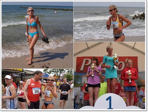 Górna lewa fotka...spacerek po plaży a wła¶ciwie zapoznawanie sie z "urokami" trasy, po prawej...podczas biegu, dolna lewa fotka..chwil kilka przed startem do biegu(przywitanie z Jackiem) po prawej..dekoracja najlepszych Pań z Teamu MaratonyPolskie.