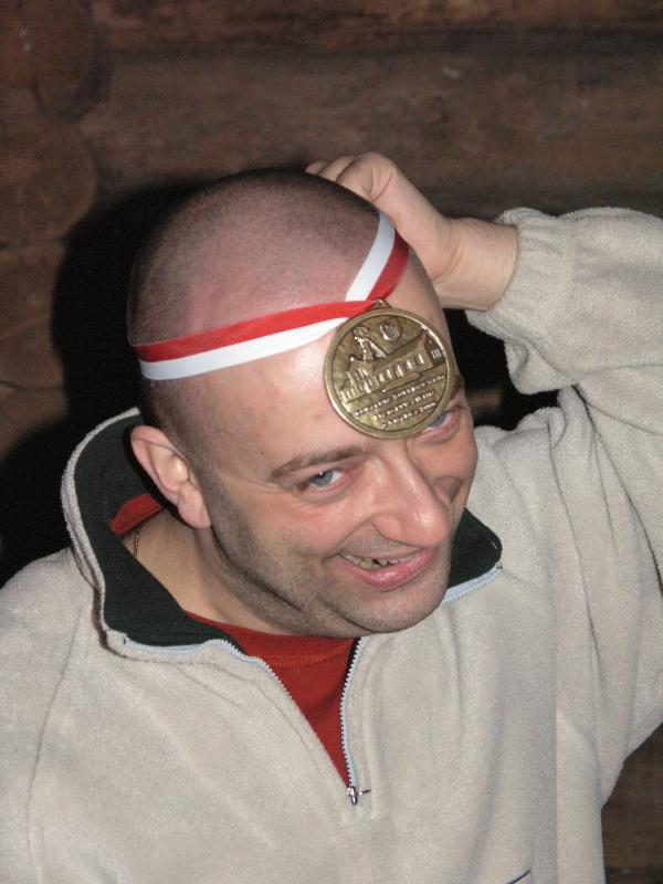 | Bochnia 2006 - uroczyste zakładanie wymęczonego podczas 12-godzinnej sztafety medalu. Było ciężko :-)