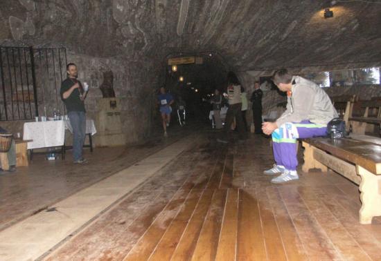 Po nawrocie ten nawiew popycha, ale i podnosi temperaturę, że z biegaczy pot się leje, bo w Komorze Ważyn utrzymuje się cały czas temperaturę 15 stopni. Aby szybciej biec warto zmieniać się co pętlę, ale wtedy po każdych 2.420 metrach biegu ma się tylko około 30 minut przerwy. Można się przebrać czy napić w tym czasie herbaty, ale te socjalne pomieszczenia są 40 metrów niżej. Fajnie się w dół zsuwa 140-metrową zjeżdżalnią na poduszkach, ale powrót to 306 schodków. Już po kilku takich wspinaczkach brakuje sił na bieg, a zabawa trwa 12 godzin. W tym czasie ubiegłoroczni mistrzowie Chemia-hurt Rybnik przebiegli 201.167 metrów bijąc Browar Czarnków o prawie 9,5 km, a rekord tych nadnoteckich piwoszy z 2005 roku o 4.292 m.