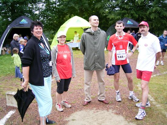 Deszcz pada, grunt coraz bardziej rozmięka, na łydkach mamy pancerze z błota. Zaczęliśmy w biało-czerwonych strojach narodowych, niestety niejednolitych, każdy ma jakiś inny polski akcent. Po dwóch zmianach zdjąłem przemokniętą bawełnianą koszulkę z Biegu Konstytucji 3 Maja i zamieniłem ją na klubową Galerii. Biegłem w niej już do końca. Zmęczenie coraz bardziej daje się we znaki, pot spływający do oczu trochę piecze. Nie jesteśmy pewni jak impreza się zakończy. Czy równo 6 godzin po starcie trzeba się zatrzymać w celu pomiaru przebiegniętego dystansu? Pani Kowalczyk dowiaduje się u organizatorów i okazuje się, że bieg nie kończy się równo po 6 godzinach, lecz w momencie przebiegnięcia linii mety przez zwycięską sztafetę po tych 6 godzinach.