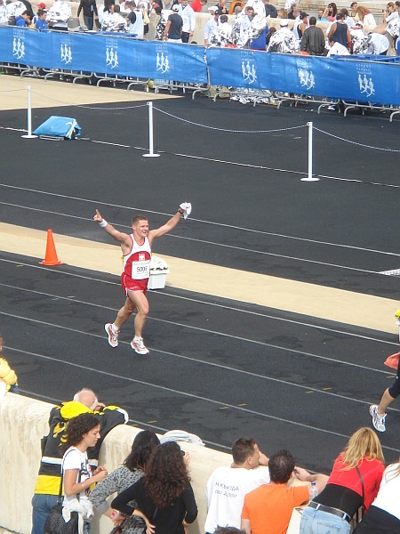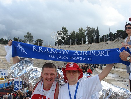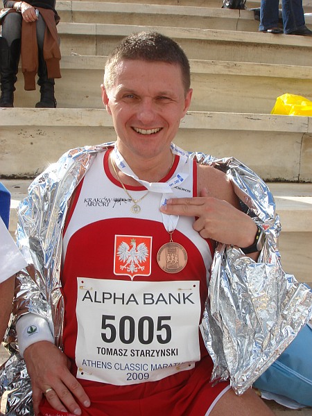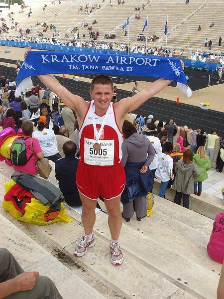Brawo, pomyślałem i gdy tylko przekroczyłem najwyższy punkt trasy dostałem skrzydeł! Wiedziałem, że jeszcze dziesięć kilometrów i możliwość wystąpienia skurczy jest bardzo realne, jednak byłem pewny swoich nóg i że okres przygotowań nie może iść na marne, biegłem rozsądnie nie zwiększając zbytnio tępa. Pozostało zawołać sobie radośnie w myślach biegnij Tomek, biegnij... Już ulice Aten, zakręt za zakrętem, w oddali między budynkami zobaczyłem Akropol. To już bardzo blisko; 5, 3, 1 km, już ostatnia prosta i stadion! Wbiegam z szacunkiem dla wszystkich biegaczy i kibiców ściągam czapkę i widzę moich wspaniałych kibiców; niebieskie szaliki z napisem Kraków Airport, widzę flagę „Biało – Czerwoną z Godłem Polski”.