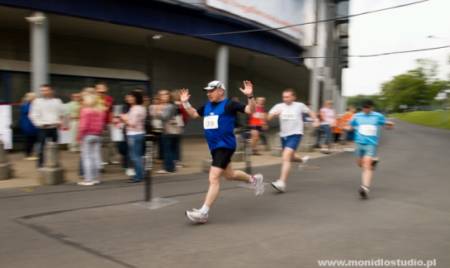 Plac przed Centrum Handlowym zaludnił się biegaczami. Stawili się licznie. Na stoiskach InterSportu i firmy Koenigserwis była możliwość doboru obuwia i specjalistycznych wkładek do butów. Był sklepik ze sportowymi ubraniami oraz prezentacja joggerów - wózków do biegania z dziećmi, a KFC przygotowało odpowiedni „wypełniacz okna węglowodanowego”. Świetną, sportową atmosferę wprowadzili komentując bieg Państwo Wilczyńscy. Dzięki Panu Rafałowi na metę wbiegali Małgosia, Zenek, Andrzej, Jurek...
