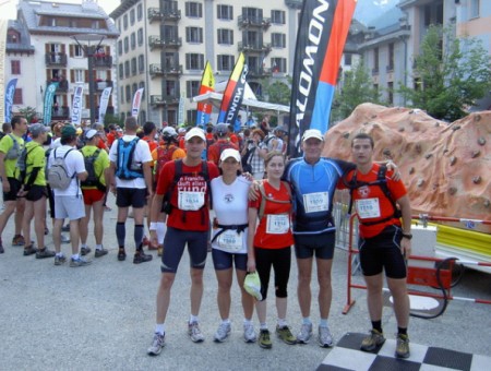 Takiego czasu nie spodziewałem się: 7:45… Wypijam jedną butelkę wody, drugą biorę ze sobą. Zabieram swój depozyt, przebieram koszulkę, siadam znowu na jakimś murku, tyłkiem do Mont Blanca i nagle dzwoni komórka. Krysia pyta się gdzie jestem, bo ona jest na mecie! A bała się czy ją nie zdejmą za przekroczenie limitu czasowego po drodze. Jest tylko 11 min za mną. Za nią przybiegnie wkrótce Jarek, potem Robert. Natomiast Ania i Mariusz dużo przed nami, zdążyli wcześniej zjechać kolejką z Planpraz do Chamonix. Spotykamy się na dole cali i zdrowi i niezwykle zadowoleni, z medalami na szyi: Mont Blanc Maraton Chamonix 2010.