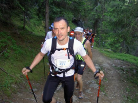 Na takiej trasie, oprócz aparatów także bardzo przydaje się… solidne przygotowanie, to nie jest zwykły maraton. To jest „masakra” jak powiedział Mariusz z bardzo dobrym czasem na mecie. Ale po kolei, do Valorcine maraton jest całkiem przyjemny. Jest jeszcze chłodno, na początku lekkie przetasowania zawodników, bo jest szeroko; potem zaczynają się podbiegi w lesie, ale niezbyt długie, zresztą na wąskich odcinkach w okolicy mojego tempa, biegacze posuwają się żwawym marszobiegiem. Dobiegamy do punktu odświeżania na 18 km, gdzie kuszą duże butle z Colą, piję chętnie, coś przegryzam i zaczyna się mozolna wspinaczka: 941 m różnicy wzniesień. Większość biegaczy idzie. Mijam Roberta, mówi, że ma tu już lepszy czas jak rok temu; wygląda bardzo dobrze (foto).