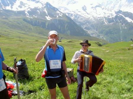 Gdy wreszcie wybiegamy na przełęcz des Possettes, dech w piersi zapiera nie brak tlenu, lecz oszałamiający widok na cały masyw Mont Blanc i sąsiadujące z nim 4 tysięczniki. Przy punkcie odżywczym niespodzianka: gra na akordeonie ten sam muzyk, którego widziałem dzień wcześniej podczas pasta party. A jest jeszcze przed nami najwyższy punkt : 2201 m.npm. z którego widoki będą na pewno lepsze! Pod szczytem jest prawdziwy śnieg, co stanowi dodatkową atrakcję, ale widzę, że niektórzy omijają go dużym łukiem. Rosną tutaj śliczne, kwitnące krzewy róży alpejskiej. Widać, że w zgodzie zapanowały tutaj 3 pory roku: zima, zielona wiosna i lato. Cieszę się, że dopisała bezchmurna pogoda, błękit nieba i biel szczytów kłują w oczy. Brak tylko… aniołków, bo tak będzie pewnie w …raju!